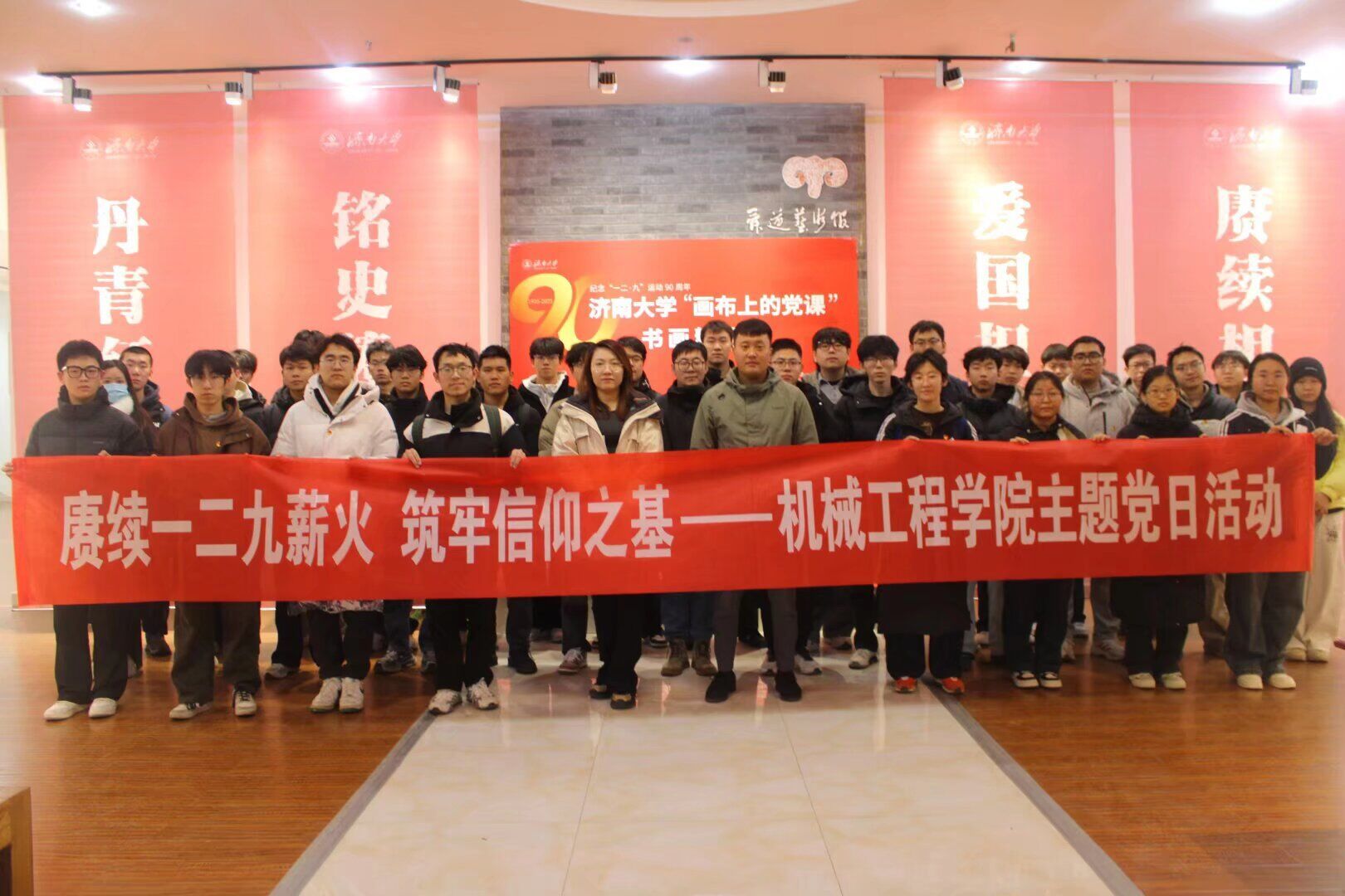 纪念“一二·九”运动90周年“画布上的党课”书画精品展。展览中,一幅幅以红色历史、青年爱国奋斗为核心的书画作品,将“一二・九”运动里学子们的热血呐喊与新时代青年的使命担当鲜活串联,新发展预备党员们驻足作品前,深刻感悟先辈们不畏强暴、奋起抗争的爱国精神,党员们纷纷表示要传承红色基因,以更加饱满的热情投身专业学习与科技创新。